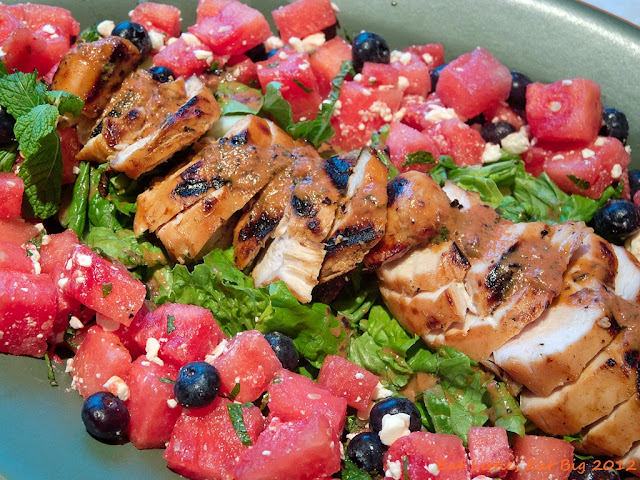 We enjoyed the last summer super salad so much that I've pretty much added it to the weekly rotation. This version has refreshing and juicy watermelon mingling with blueberries, feta and mint, a simple vinaigrette and a summer staple-grilled chicken. Once again, Mr. ELEB did his magic on the grill and contributed perfectly cooked chicken breasts. A quick vinaigrette whipped together in the blender, a toss together of the watermelon, blueberries, feta and mint, and dinner was on the table in just about 30 minutes.