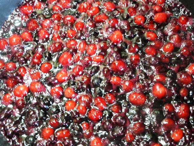 Chef Dennis's amethyst topping bubbling away-cranberries, blueberries, sugar, lemon, cornstarch. Topping for cheesecake tomorrow.