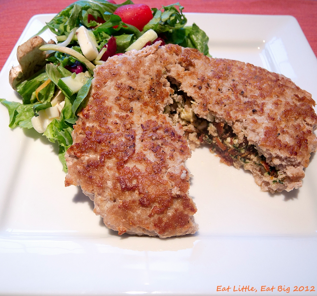 Mmmm, little pockets of goodness tucked inside a moist, delicious turkey burger! These are a little too fragile for the grill. They cook up quickly in a pan with a little olive oil for browning. Make sure not to overcook or they will be dry.
