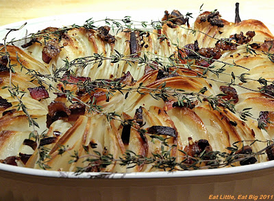Bake 1 1/4 hours. Add thyme and bake until potatoes are cooked through with a crisp top, about 35 minutes more.
